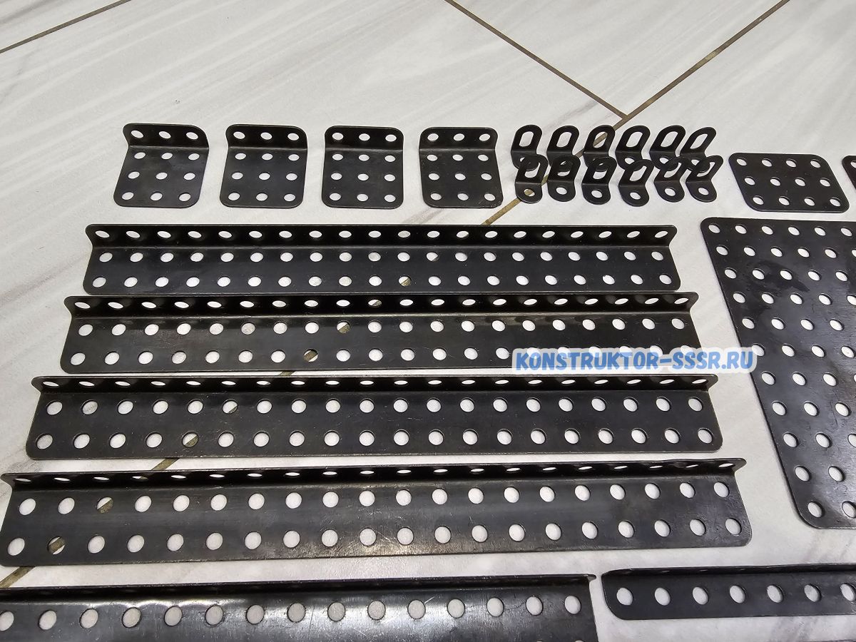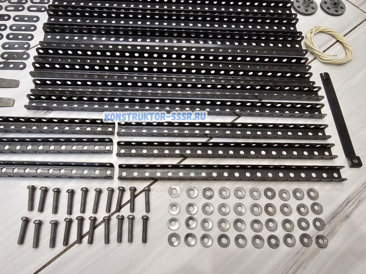 В этой коробке находится набор простых деталей, предназначенных для сборки моделей различных механизмов, машин, сооружений. Стандартная длина, ширина и высота наших деталей позволяют многообразно их составлять вместе в различных узлах. А равномерные ряды одинаковых отверстий позволяют скреплять эти узлы винтами и гайками.